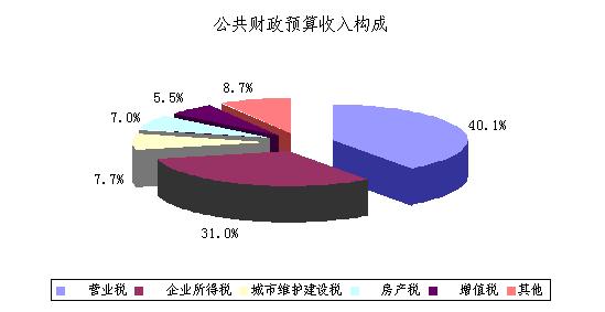 公共财政预算收入 据财政部门初步统计,全年完成公共财政预算收入309.1亿元,比上年增长10.5%。营业税、企业所得税、城市维护建设税、房产税和增值税五大主体税种共完成282.2亿元,占本年度公共财政预算收入的91.3%,比上年增长10.7%。其中,营业税124.0亿元,比上年增长10.3%;企业所得税95.9亿元,比上年增长13.1%;城市维护建设税23.7亿元,比上年增长1.3%;房产税21.6亿元,比上年增长5.4%;增值税17.0亿元,比上年增长24.0%。