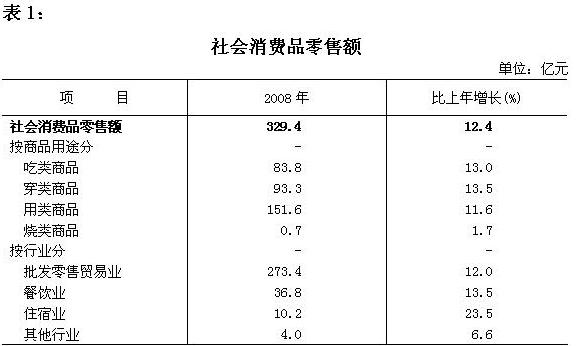 消费市场 消费市场繁荣稳定。全年实现社会消费品零售额329.4亿元,比上年增长12.4%。按用途分:吃类商品实现零售额83.8亿元,比上年增长13%;穿类商品实现零售额93.3亿元,比上年增长13.5%;用类商品实现零售额151.6亿元,比上年增长11.6 %;烧类商品实现零售额0.7亿元,与去年基本持平。