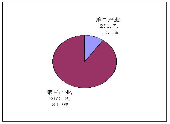 经济总量 据初步统计,西城区实现地区生产总值2302亿元,比上年增长11.9%。其中,第二产业实现增加值231.7亿元,比上年增长4.4%,第三产业实现增加值2070.3亿元,比上年增长12.8%,占全区GDP比重达到89.9%。